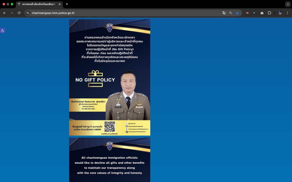 O17 ประกาศนโยบายต่อต้านการรับสินบน (Anti-Bribery Policy) 26 มีนาคม 2568 โดย immchachoengsao_ccs / ITA,ITA,ITA2568 ประกาศ ตรวจคนเข้าเมืองจังหวัดฉะเชิงทรา เรื่อง นโยบายต่อต้านการรับสินบน (Anti-Bribery Policy) และการไม่รับของขวัญของกํานัลหรือ ประโยชน์อื่นใด (No Gift Policy) จากการปฏิบัติหน้าที่ ประจําปีงบประมาณ พ.ศ.๒๕๖๘ Announcement of Chachoengsao Immigration Subject: Anti-Bribery and not accepting gifts or any other benefits (No gift policy) from performing duties Fiscal of the year 2025 ภาพการเผยแพร่ ณ จุดบริการ หรือ จุดประชาสัมพันธ์ ภาพการเผยแพร่บนหน้าเว็บไซต์ของหน่วยงาน Facebook iconFacebookTwitter iconTwitterLINE iconLine