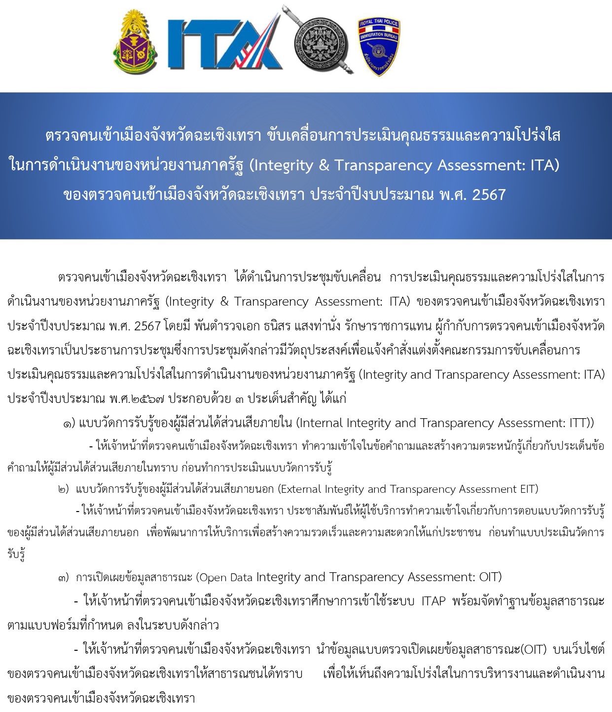 O5 การประชาสัมพันธ์ข้อมูลผลการดำเนินงาน 30 มกราคม 2567 โดย immchachoengsao_ccs / ITA 1. ผลการปฏิบัติประจำเดือน ตุลาคม 2566 พฤศจิกายน 2566 ธันวาคม 2566 มกราคม 2567 กุมภาพันธ์ 2567 มีนาคม 2567 เมษายน 2567 2. สื่อสังคมออนไลน์ของตรวจคนเข้าเมืองจังหวัดฉะเชิงเทรา 3. ประชาสัมพันธ์ข้อมูลการประเมินคุณธรรมและความโปร่งใสในการดำเนินงานของหน่วยงานภาครัฐ (INTEGRITY AND TRANSPARENCY ASSESSMENT: ITA) 4. ประชาสัมพันธ์ข้อมูลการตอบแบบวัด EIT Facebook iconFacebookTwitter iconTwitterLINE iconLine